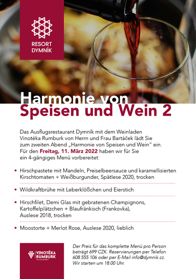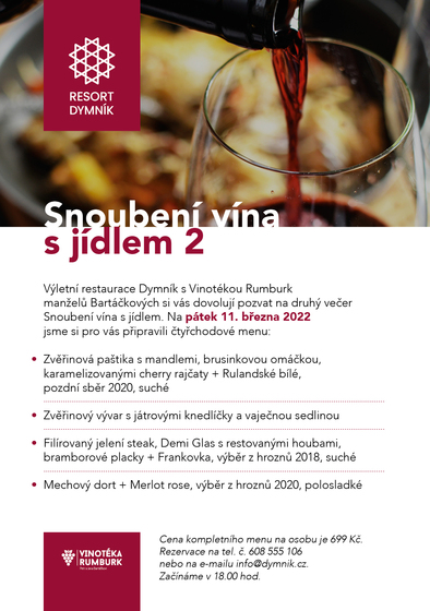 Ve spolupráci s Výletní restaurací Dymník si Vás dovolujeme pozvat na první večer Snoubení jídla s vínem v pátek 11. března 2022.
