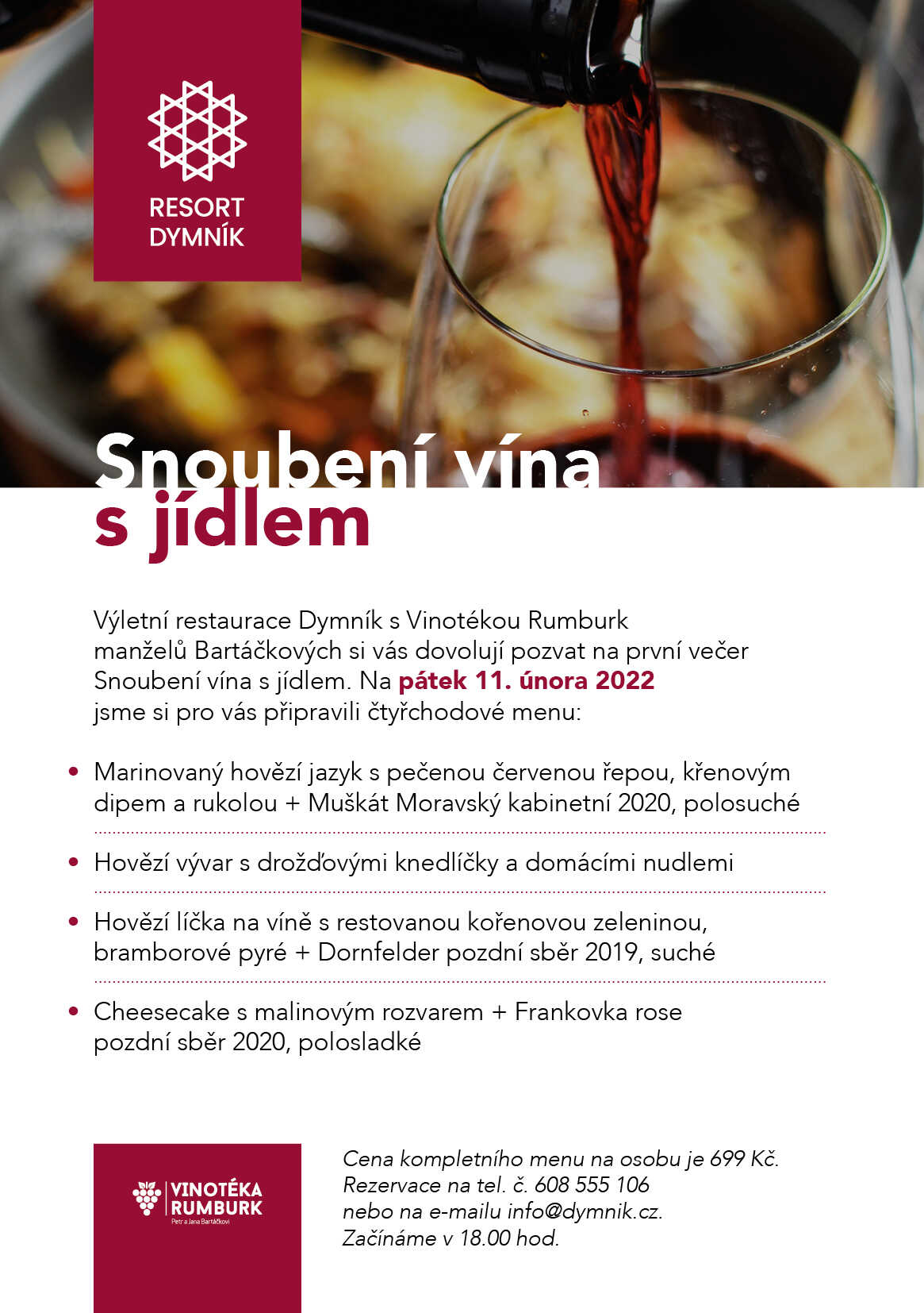 Ve spolupráci s Výletní restaurací Dymník si Vás dovolujeme pozvat na první večer Snoubení jídla s vínem v pátek 11. února 2022.