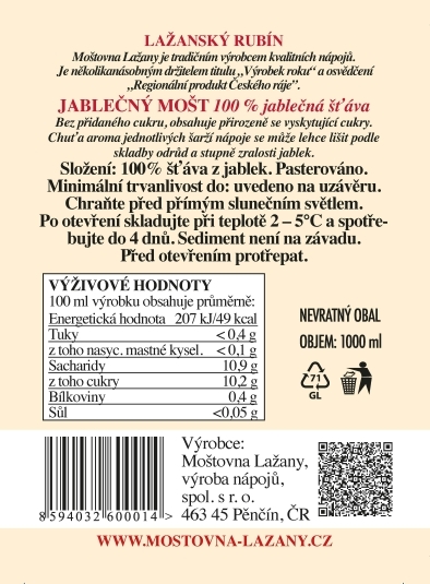 Jablečný mošt je čistá přírodní šťáva získaná z jablek vypěstovaných na okraji CHKO Český ráj. Chuť i aroma jednotlivých šarží se lehce liší podle skladby odrůd a stupně konzumní zralosti. Právě to je důkazem čistě přírodního původu. Jablečná šťáva pozitivně působí na nervový systém, účinně snižuje cholesterol v krvi a je výborná proti onemocnění srdce a cév i proti infarktu. Působí proti únavě. Mošt není doslazován, proto je vhodný při různých dietách. Je zdrojem vitamínů a vlákniny. Pro svoji lahodnou chuť se používá i jako teplý nápoj. Možná je stejná příprava jako u svařeného vína. Pro osvěžení jej lze pít s vodou či minerálkou.