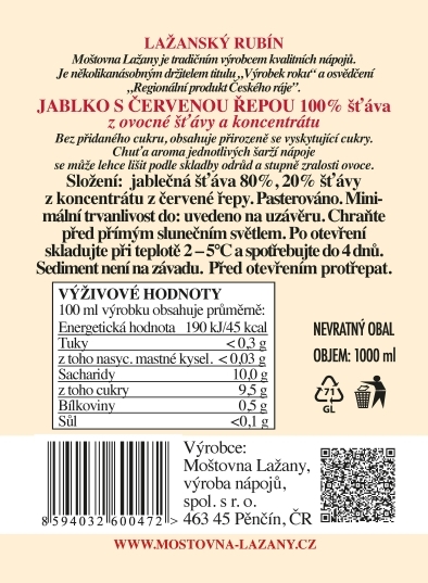 Vyrábí se ve složení 80% jablečné šťávy a 20% šťávy z protlaku červené řepy, pasterováno bez chemické konzervace a bez přídavku cukru či jiného sladidla. Chuť je překvapivě lahodná s mnohem širší paletou vitamínů, než mají jednodruhové nápoje